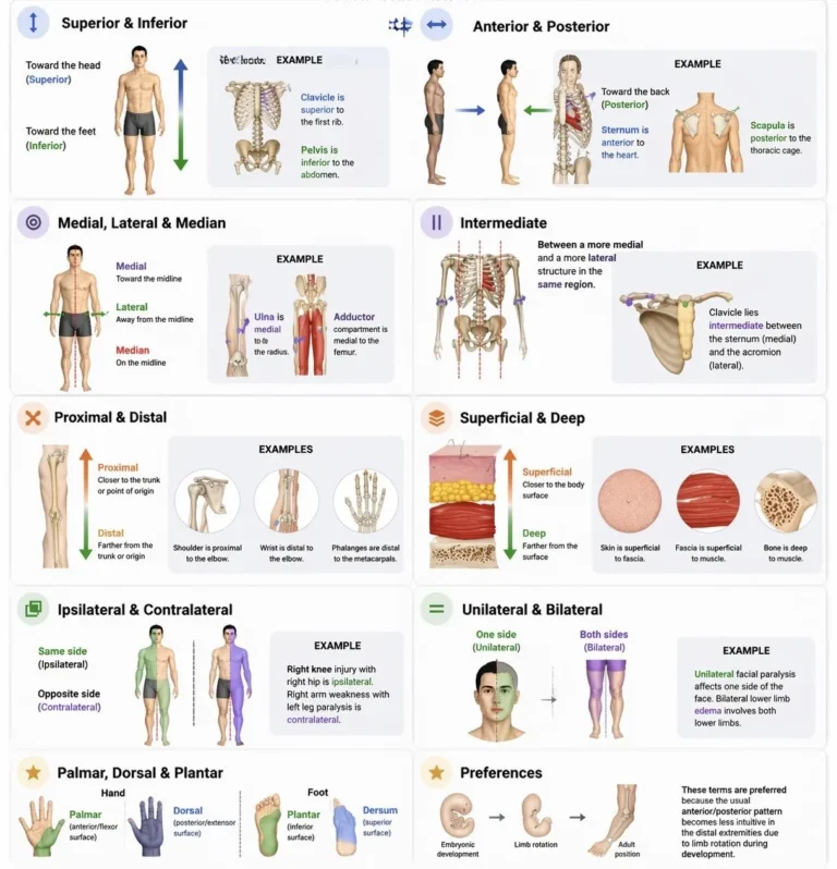 Their principal function is to eliminate ambiguity: structures are not described using imprecise terms such as “above,” “below,” or “to the side,” but by precise anatomical terms that remain constant regardless of the patient’s posture during examination or imaging.