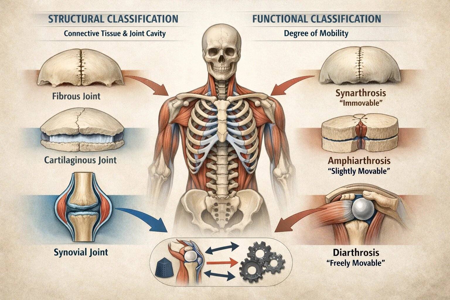 Two complementary systems are recognized. Structural classification is defined by the type of tissue uniting the bones and the presence or absence of a synovial cavity, categorizing joints into fibrous, cartilaginous, and synovial types. Functional classification is based on the degree of mobility permitted between articulating surfaces, ranging from synarthrosis (immobile) through amphiarthrosis (limited movement) to diarthrosis (freely mobile).