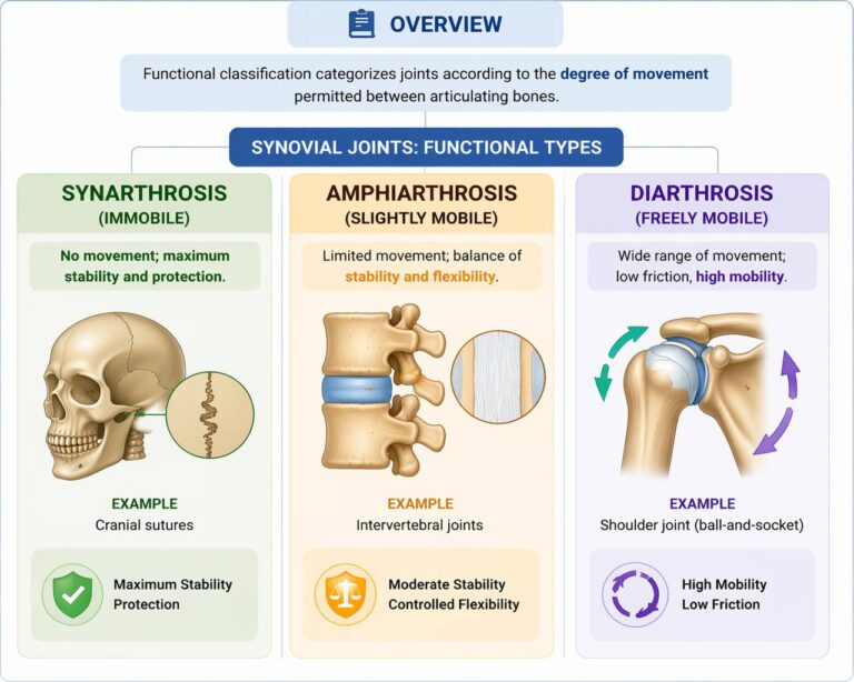 From a biomechanical perspective, functional classification determines the degrees of freedom available at a joint, the range and axes of motion, and the capacity for load transmission and absorption. Immobile joints prioritize structural integrity and protection, whereas highly mobile joints facilitate complex, multiaxial movement at the cost of reduced passive stability.