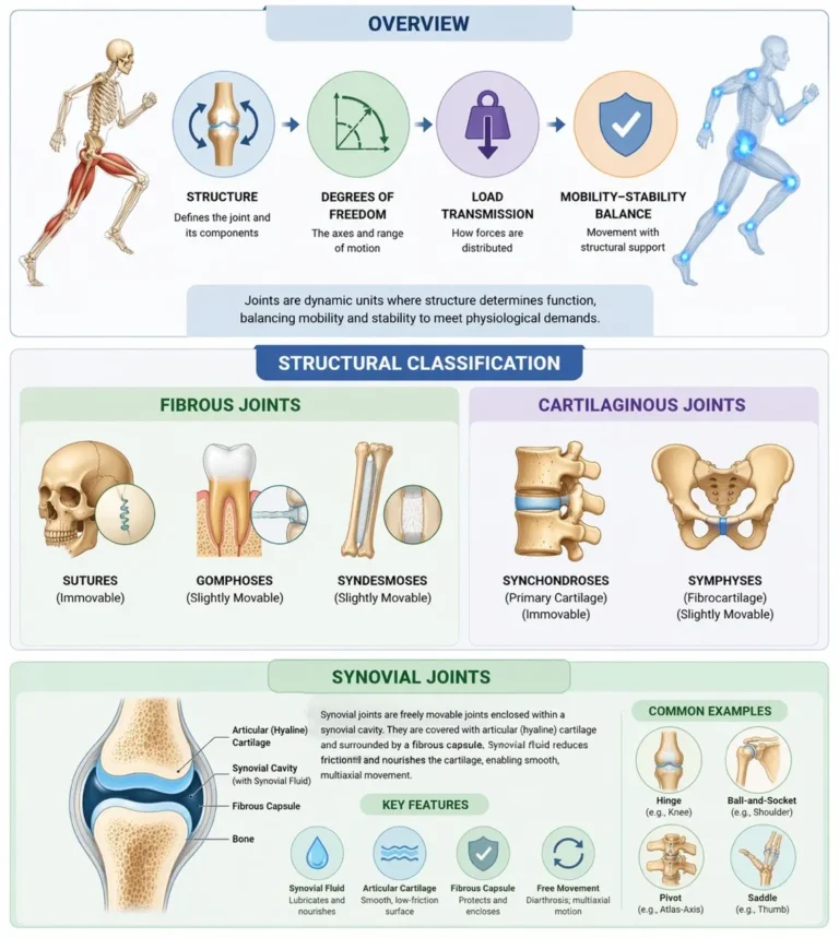 These systems are functionally inseparable, as structural design determines mechanical performance. The material properties of connective tissue, the geometry of articular surfaces, and the presence of a synovial cavity collectively regulate degrees of freedom, load distribution, and joint kinematics. Thus, joint classification is not purely descriptive but predictive, allowing inference of movement capacity, stability, and clinical behavior from anatomical structure.