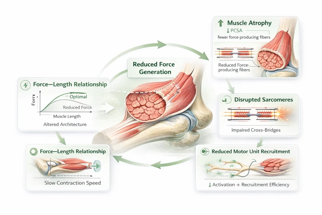 Collectively, these impairments compromise both peak force and functional muscle performance across the range of motion.