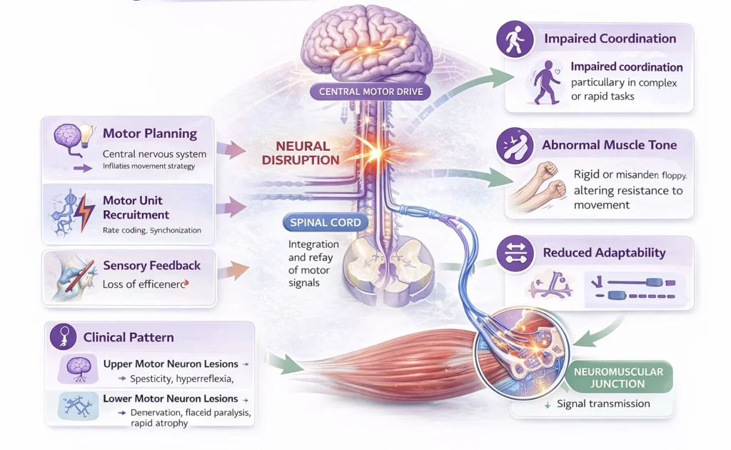 These disturbances impair the ability of the nervous system to generate smooth, adaptive, and task-specific motor output.