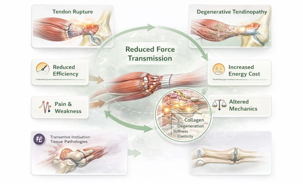 Tendons and intramuscular connective tissues form a continuous mechanical interface that transmits force generated within muscle to the skeleton. Effective transmission depends on both structural integrity and viscoelastic properties of the collagen matrix.
