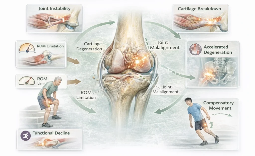 Load transmission → increased focal stress on cartilage, subchondral bone, and periarticular tissues