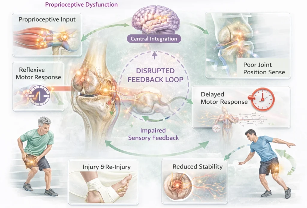 Post-ligament injury (e.g., ACL) → loss of joint proprioception