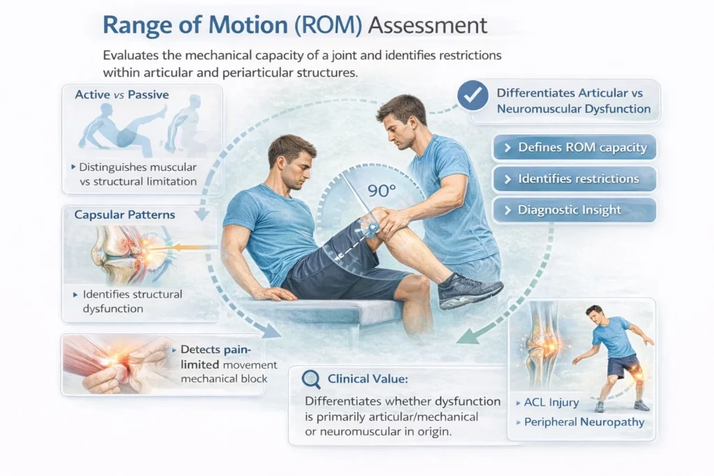 Range of motion (ROM) → capsular restriction, structural limitation, or pain-mediated guarding
