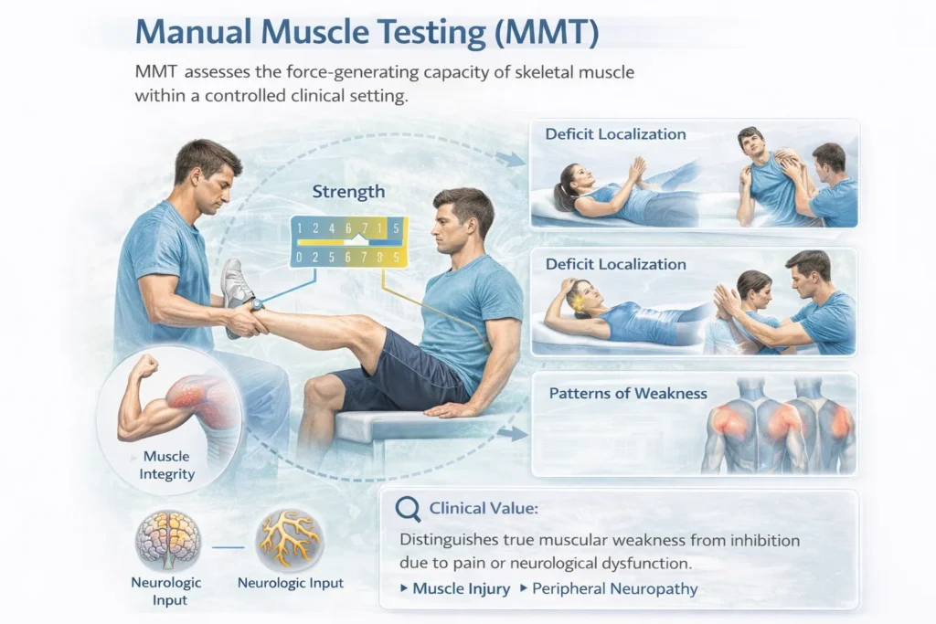 MMT assesses the force-generating capacity of skeletal muscle within a controlled clinical setting.