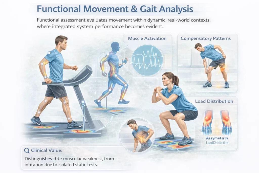 Functional assessment evaluates movement within dynamic, real-world contexts, where integrated system performance becomes evident.