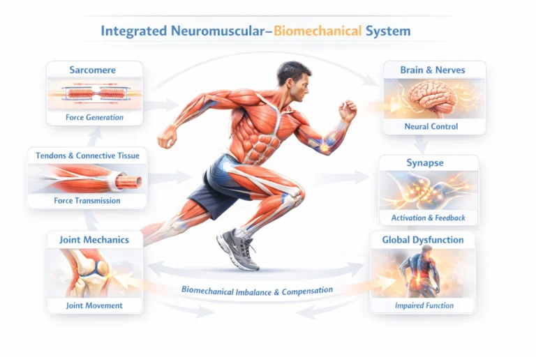 Human movement represents the integrated output of a neuromuscular–biomechanical continuum, in which muscle contraction, connective tissue transmission, joint mechanics, and neural control operate as a unified system. Skeletal muscle functions as the primary effector, but its output depends on coordinated interaction with tendons, joints, and neural pathways.