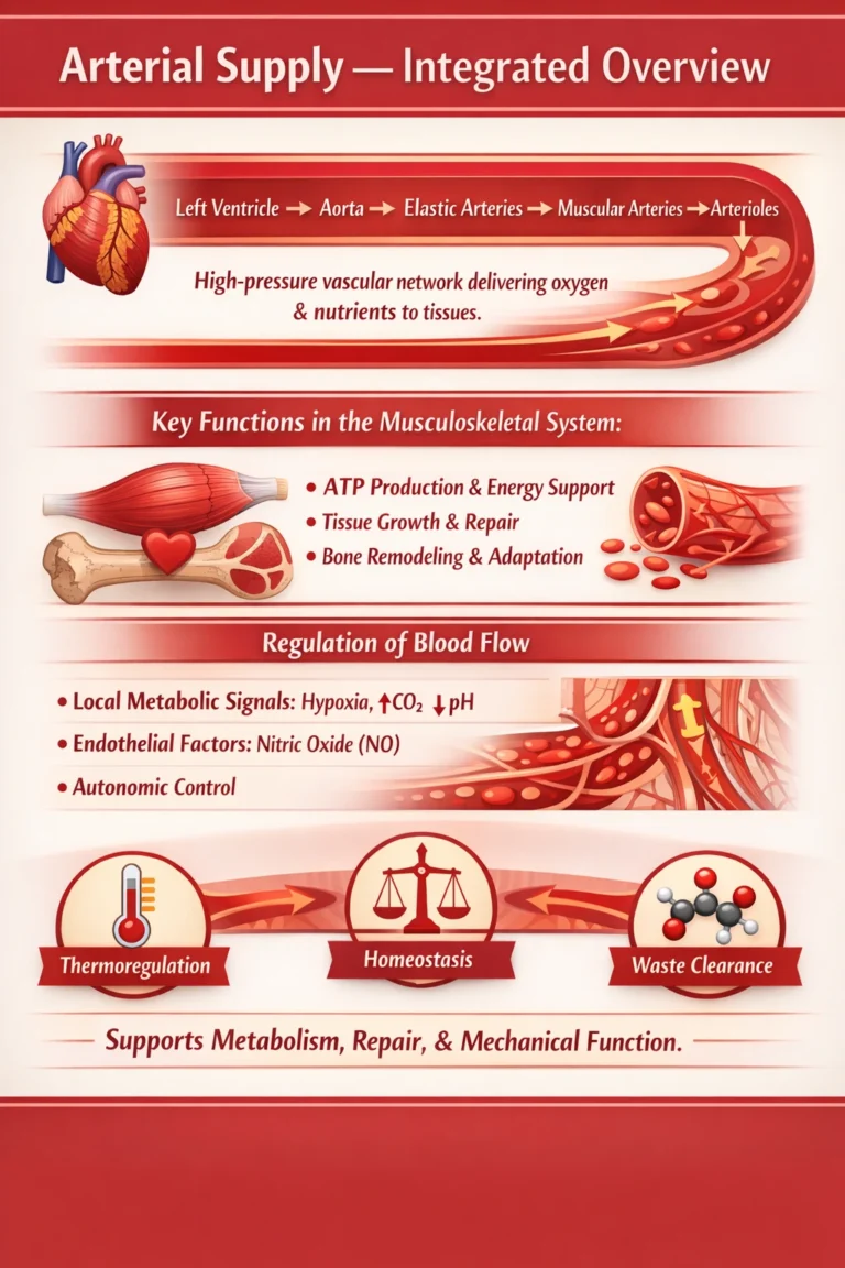 Within the musculoskeletal system, arterial circulation is fundamental for sustaining mechanical performance and structural integrity. By delivering oxygen and metabolic substrates, it supports ATP production required for muscle contraction, facilitates tissue repair and remodeling, and contributes to joint function through synovial and subchondral perfusion. Furthermore, arterial supply enables adaptation to mechanical stress by supporting cellular turnover and structural reinforcement.