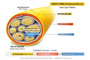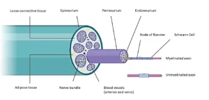 Within a peripheral nerve, thousands of individual axons are arranged into fascicles and enclosed by multiple connective tissue sheaths. These structural layers collectively maintain the functional integrity of nerve fibers, facilitate vascular supply, and protect neural tissue during movement and mechanical loading within the musculoskeletal system.