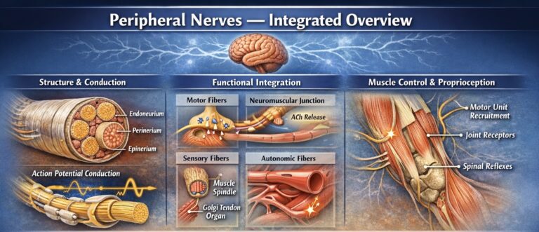 Peripheral nerves are functionally heterogeneous mixed structures composed of motor (efferent), sensory (afferent), and autonomic fibers that connect the central nervous system with peripheral tissues. Within a single nerve trunk, these fiber types are organized into fascicles and conduct impulses bidirectionally, enabling continuous integration of movement, sensation, and autonomic regulation.