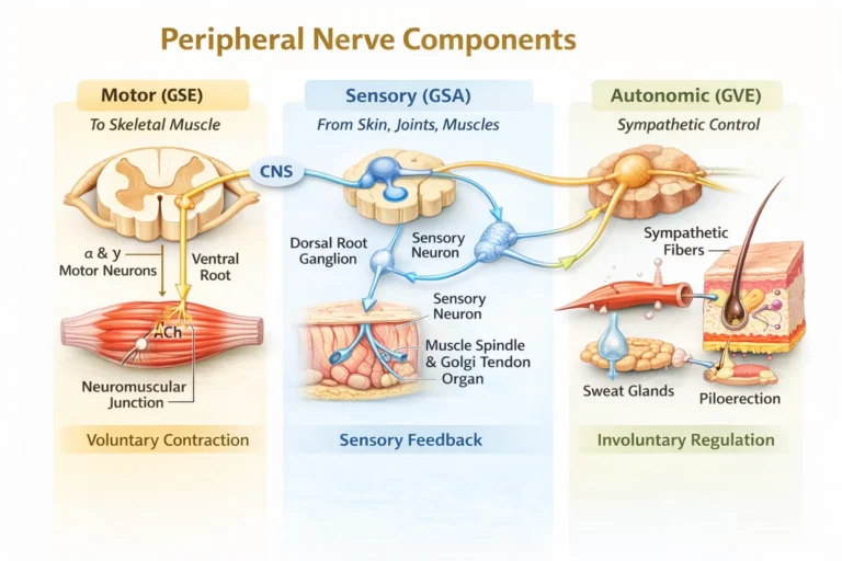 A single nerve provides motor output, sensory feedback, and autonomic regulation of vascular tone and metabolism. This forms a closed-loop system in which afferent input – via spinal and supraspinal integration – modulates efferent activity, ensuring precise control of movement, tone, and posture.